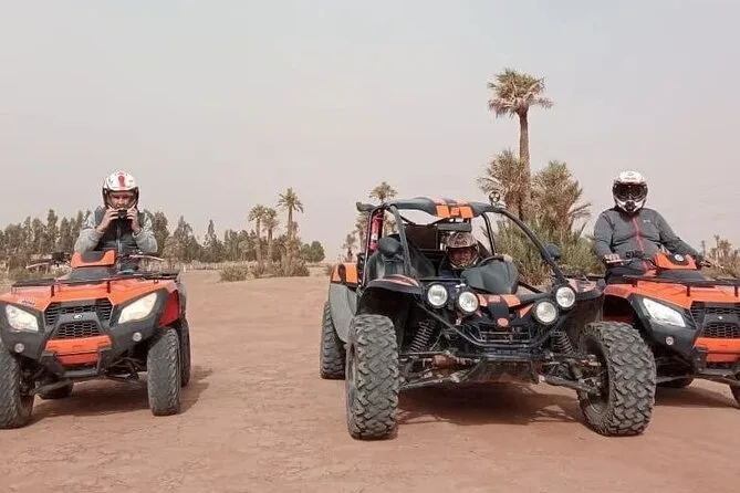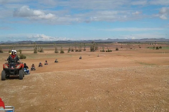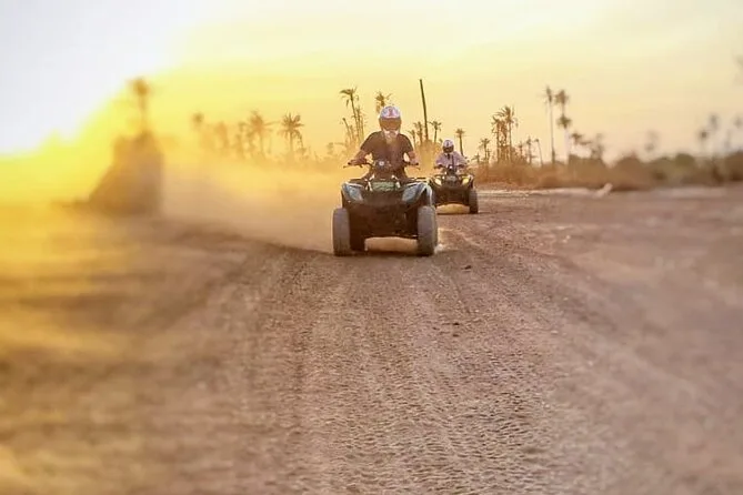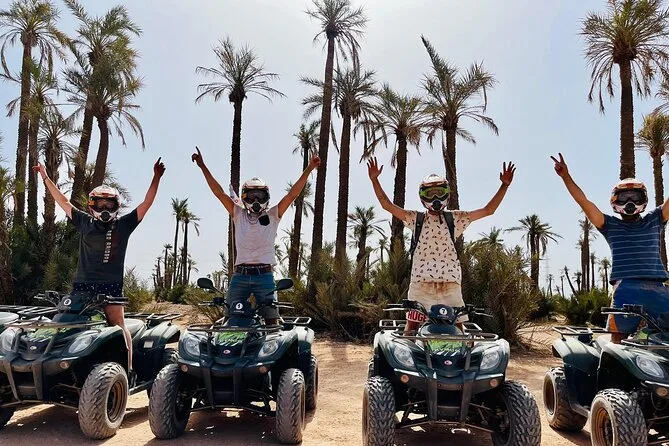 Partez en quad dans la palmeraie de Marrakech avec un guide local, faites une pause thé à la menthe et crêpes dans un village berbère, et admirez des paysages volcaniques en chemin. Rires, accueil chaleureux et souvenirs inoubliables garantis.