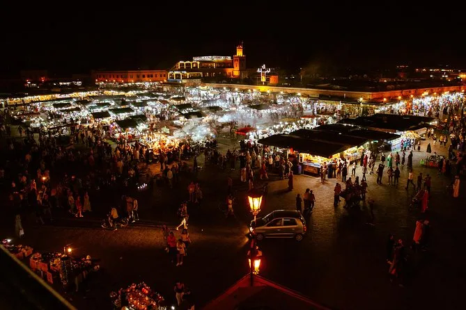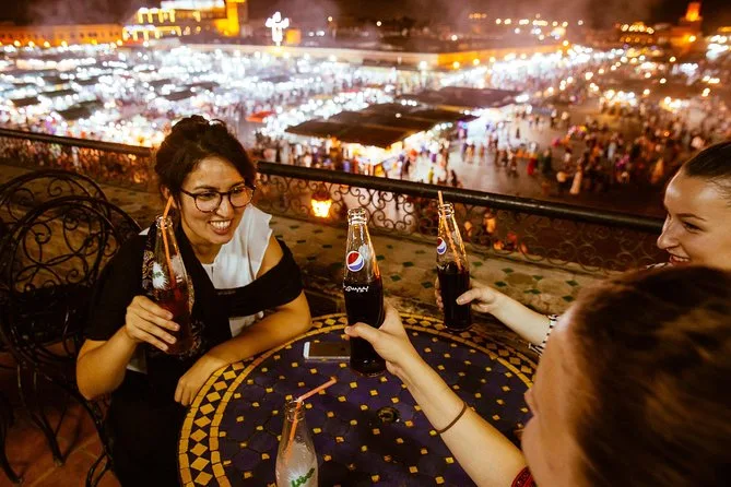 Votre soirée comprend une visite privée à pied dans le centre de Marrakech avec un guide local passionné. Vous dégusterez un café ou un thé avec vue sur la place Jemaa el-Fna tout en écoutant des histoires sur la vie dans la médina — le tout en mode carbone neutre et en petits groupes pour une ambiance intime.