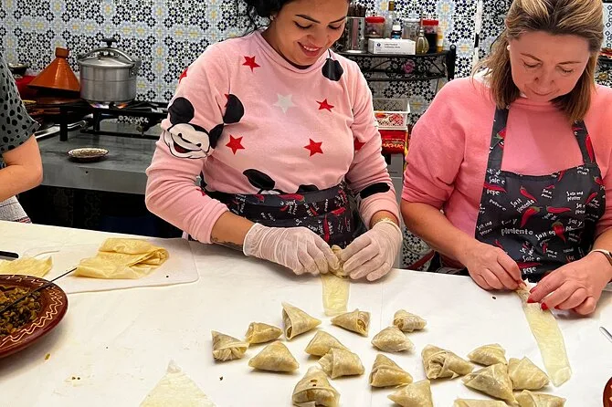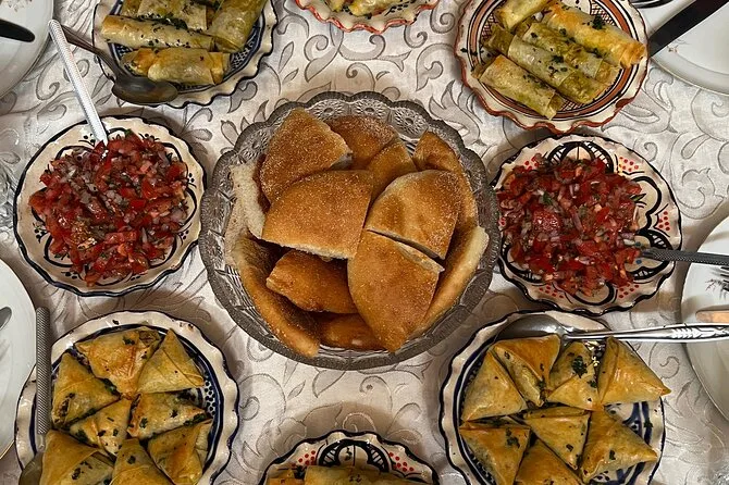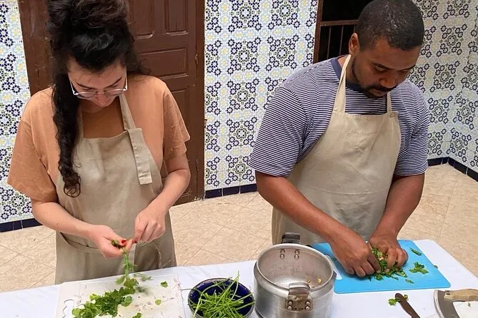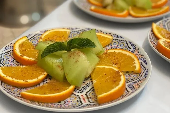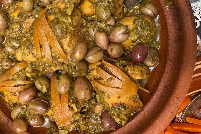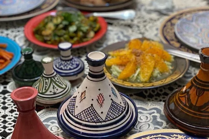 Votre journée comprend la rencontre avec vos hôtes locaux Oumaima et Laila à Marrakech, une balade au marché de quartier pour choisir les ingrédients, un petit-déjeuner avec thé marocain maison, la préparation d’une entrée, d’un plat principal (tajine de poulet ou de bœuf), d’un dessert, puis un repas complet partagé autour de leur table familiale avant de repartir.