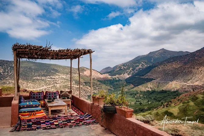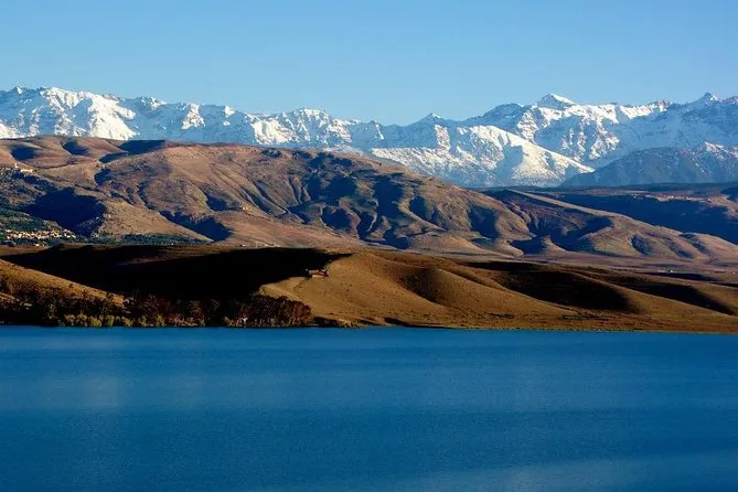 Le circuit comprend des arrêts au lac Lalla Takerkoust, des points de vue sur l’Atlas, des villages berbères, un déjeuner chez l’habitant, une randonnée optionnelle et une balade à dos de chameau.