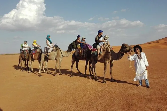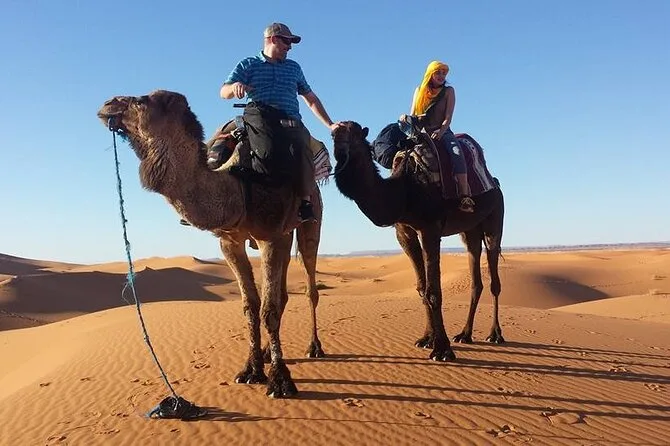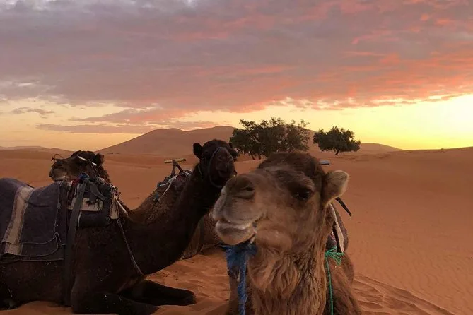 Votre expérience comprend le transfert depuis votre hôtel à Marrakech, tous les trajets en voiture climatisée avec votre chauffeur/guide privé (qui s’arrête où vous voulez), une nuit en hôtel dans les gorges du Dadès avec dîner et petit-déjeuner, une nuit en camp de luxe dans le Sahara (tente privée avec salle de bain), des balades à dos de chameau dans les dunes d’Erg Chebbi au coucher et lever du soleil, du sandboard si vous le souhaitez, ainsi que des balades faciles à la kasbah d’Aït Ben Haddou et dans les gorges du Todgha avant d’arriver à Fès.