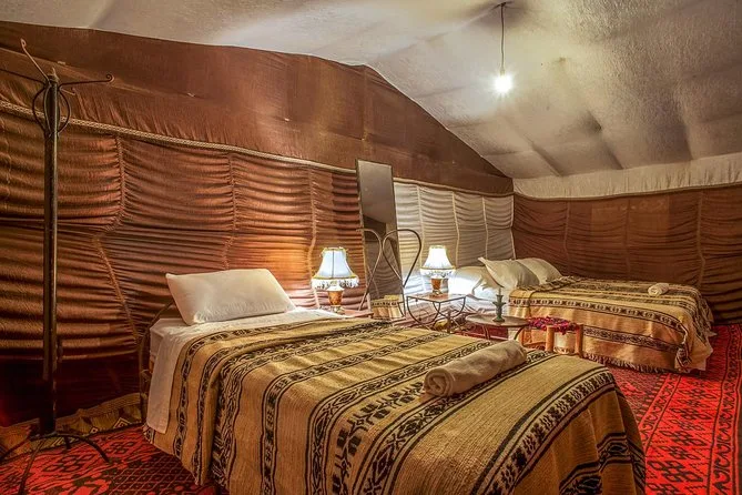 La première nuit se passe dans un hôtel kasbah traditionnel dans les gorges du Dadès ; la deuxième dans une tente privée avec salle de bain dans un camp de luxe au Sahara.