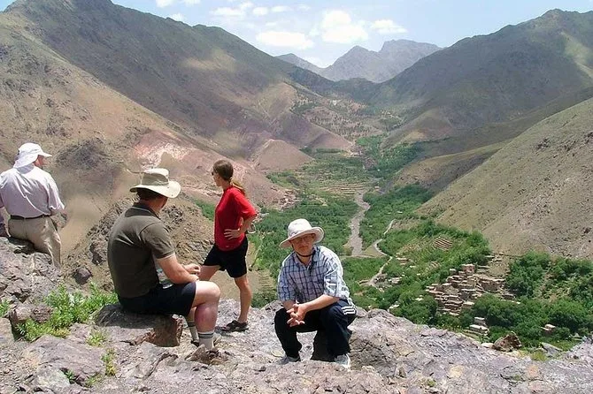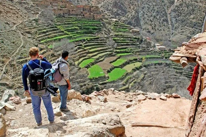 Vous passerez la journée à randonner dans les contreforts de l’Atlas avec un guide local, à faire une balade à dos de chameau au bord de la rivière Moulay Ibrahim, à partager un thé à la menthe dans un village berbère, et à savourer un tagine maison pour le déjeuner. Attendez-vous à des moments de rires et de calme en marchant sur des sentiers anciens—peut-être repartirez-vous avec de la poussière sur vos chaussures et des images plein la tête.