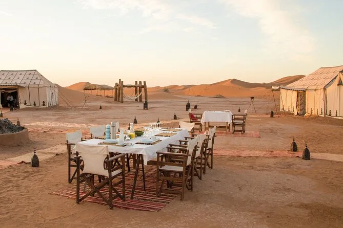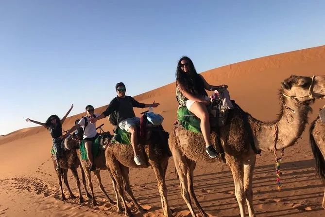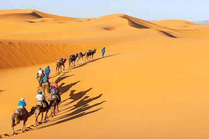 Votre voyage inclut la prise en charge et le retour à l’hôtel à Marrakech, tous les transports avec un chauffeur-guide professionnel, deux nuits (une en guesthouse ou hôtel dans la vallée du Dadès, une autre en camp dans le désert), votre propre chameau pour la balade dans les dunes d’Erg Chebbi, ainsi que le dîner et le petit-déjeuner au camp. Si vous avez besoin de sièges bébé ou de repas spéciaux (végétariens, etc.), merci de nous le signaler lors de la réservation.