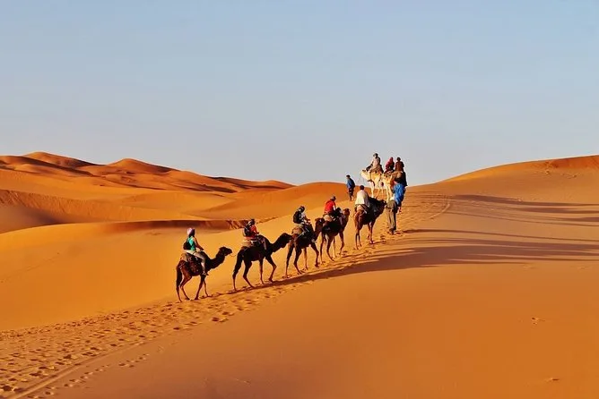 Traversez cols montagneux, explorez kasbahs ancestrales, chevauchez des chameaux dans les dunes dorées et dormez sous un ciel étoilé. Ce tour vous plonge au cœur de la vie désertique marocaine, authentique et intense.