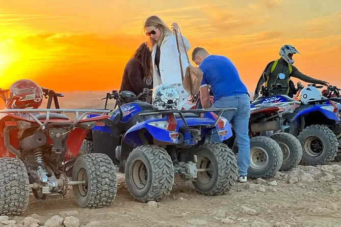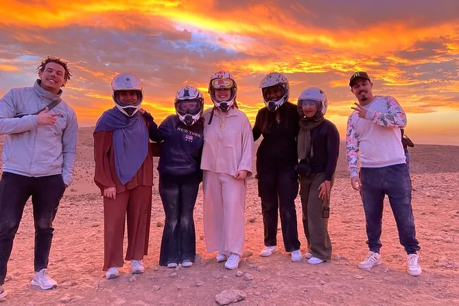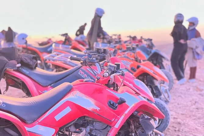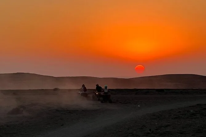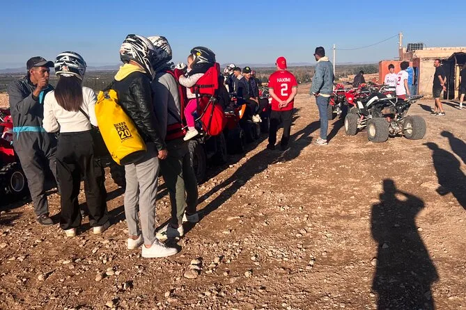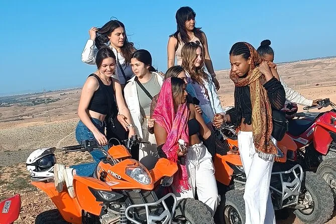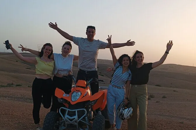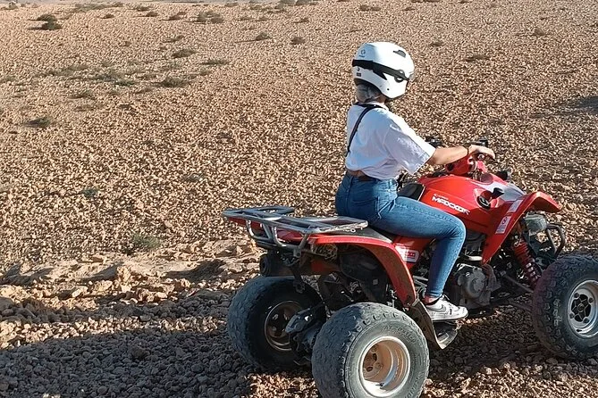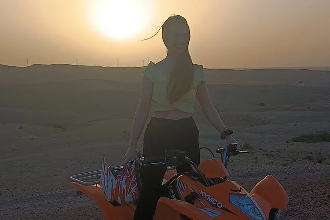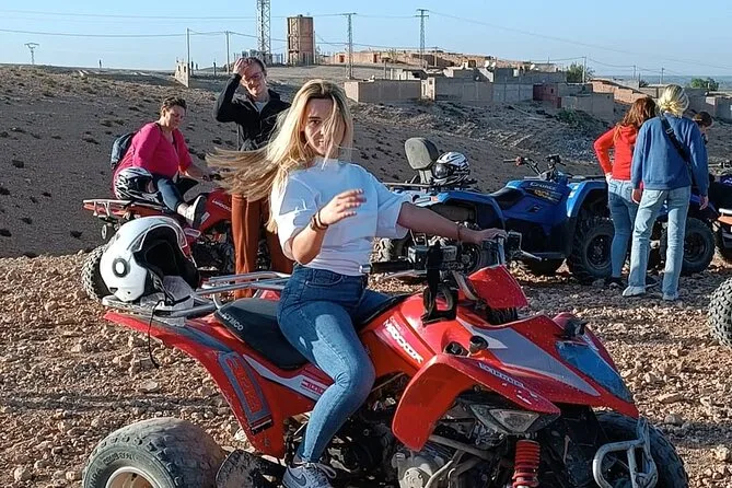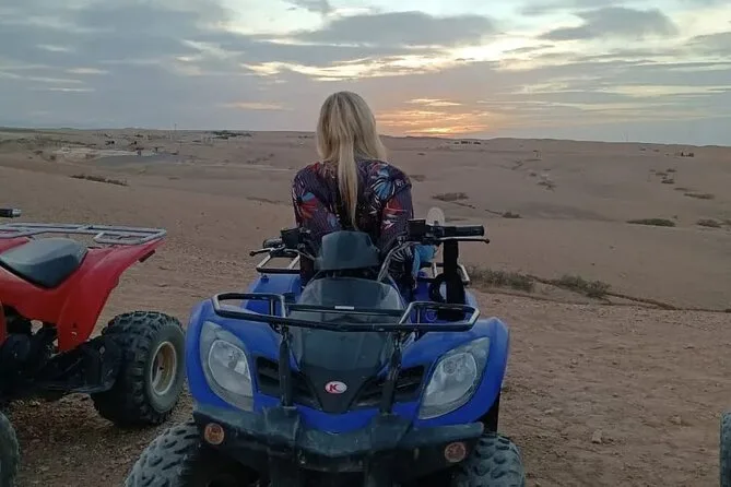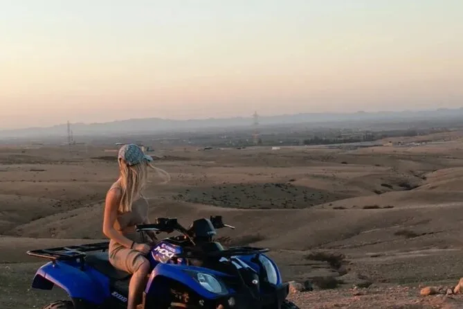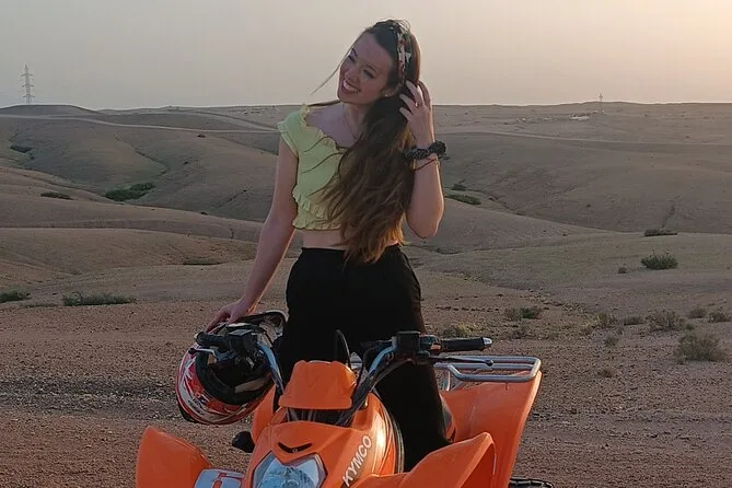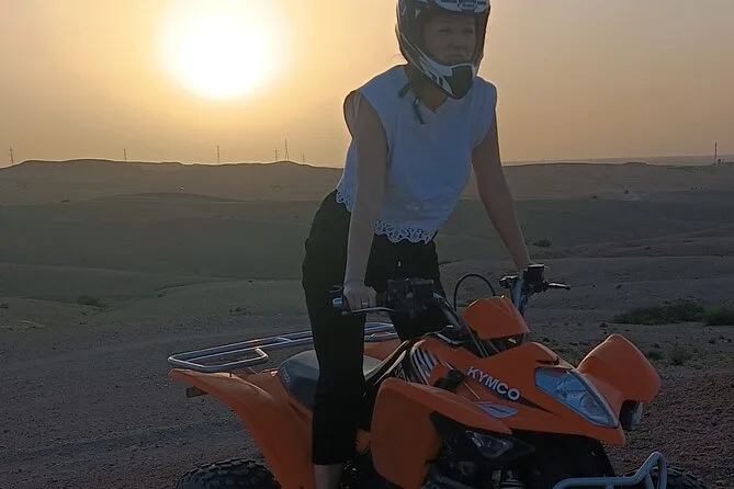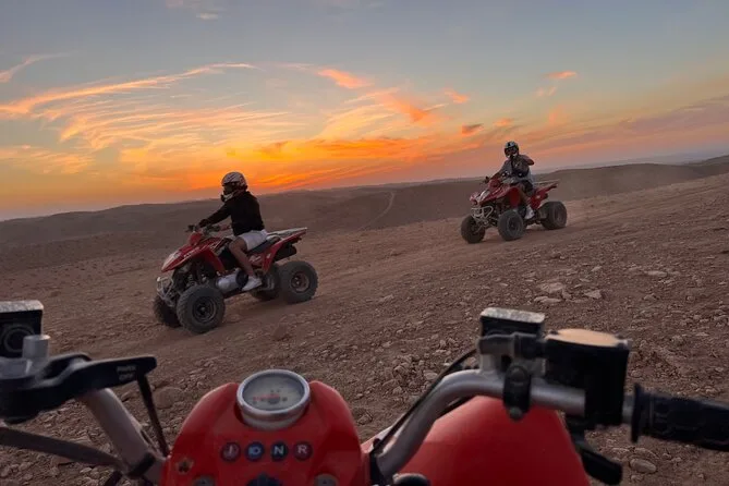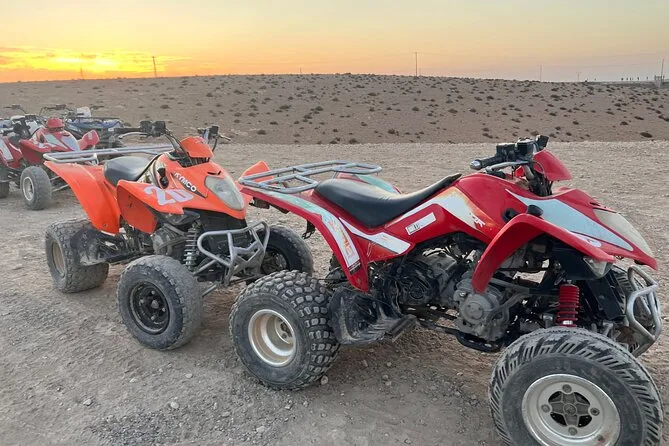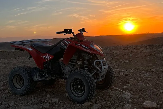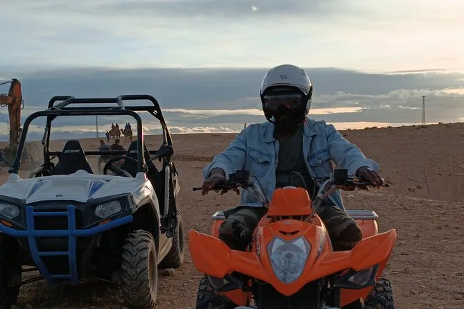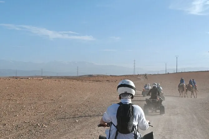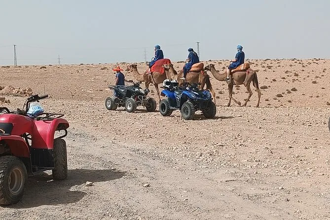 Votre journée comprend la prise en charge et le retour à votre hôtel à Marrakech en véhicule climatisé avec un chauffeur-guide professionnel ; tout l’équipement pour le quad (casque et lunettes) ; la balade guidée en quad ; un thé marocain avec des gâteaux chez une famille locale ; une balade à dos de chameau au coucher du soleil ; ainsi qu’un dîner marocain traditionnel servi sous une tente berbère ou à ciel ouvert avant de revenir à Marrakech en soirée.