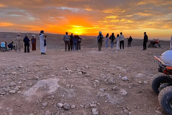 Partez en quad à travers le désert rocheux d’Agafay près de Marrakech avec un guide local, savourez un thé à la menthe sucré chez une famille, admirez le coucher du soleil à dos de chameau, puis partagez un dîner berbère traditionnel sous les lanternes et les étoiles avant de retourner à votre hôtel — une soirée pleine de petites surprises inoubliables.