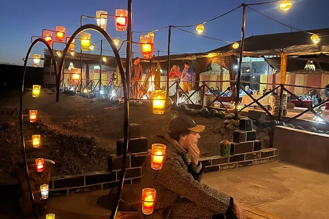 Ensuite, les chameaux — honnêtement, je ne pensais pas autant apprécier cette partie. Le mien s’appelait Atlas (comme les montagnes), têtu mais patient avec mes tentatives maladroites pour monter. Le coucher de soleil s’est installé doucement ; tout est devenu bleu-gris sauf cette ligne orange à l’horizon. De retour au camp, des lanternes dansaient autour de tables basses sous une tente berbère. Le dîner est arrivé dans des plats en terre cuite : un tagine fumant, du pain à déchirer à la main. Quelqu’un jouait du oud près du feu — pas un spectacle, juste une musique qui flottait au milieu des conversations en français et en arabe.