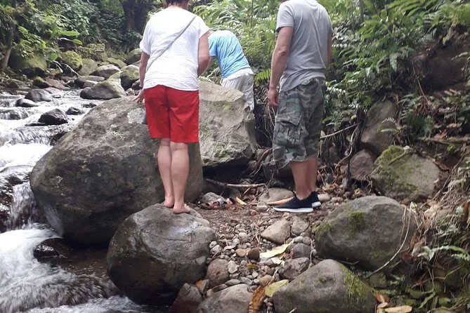 La Route de la Trace, c’était comme entrer dans un autre monde — des fougères géantes frôlant la route, la brume accrochée aux arbres. On s’est arrêtés près d’une cascade (dont je n’arrive toujours pas à prononcer le nom) pour tremper les pieds. L’eau était plus froide que prévu, mes pieds sont devenus engourdis, mais ça faisait du bien après la chaleur étouffante. Jean-Marc nous a montré comment les locaux utilisent certaines feuilles pour soigner les égratignures — il en a écrasé une pour qu’on sente, un mélange frais et terreux à la fois. Ensuite, on a pris un petit sentier en forêt avec des aperçus des Pitons du Carbet qui perçaient à travers la canopée. Voir ces vieux volcans là, immobiles, c’est impressionnant.