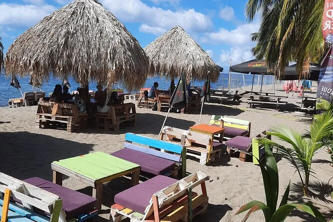 Le Domaine d’Emeraude était notre étape suivante — un immense parc botanique où l’on peut toucher et sentir les plantes utilisées dans les remèdes caribéens. Des enfants en sortie scolaire riaient en essayant d’apercevoir les oiseaux dans les arbres. Le déjeuner n’était pas inclus, mais on s’est arrêté plus tard dans un resto de plage avec transats et douches (je vous conseille de goûter le poisson du jour). Le sable y est sombre, résultat des anciennes éruptions — il s’infiltre partout mais crée un contraste saisissant avec l’eau bleue.