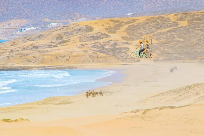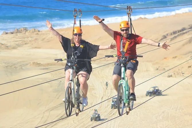 Vous êtes-vous déjà demandé ce que ça fait de pédaler sur un sky bike au-dessus du Pacifique ? Moi non, pas vraiment, jusqu’à ce qu’on soit à mi-chemin et que je sente l’air salé se mêler à l’odeur sèche et terreuse des dunes en dessous. Notre guide, Luis, plaisantait en disant que s’il me voyait faire tomber mon téléphone, il « irait peut-être le récupérer » — ce genre d’humour sec qui vous détend même quand vos jambes tremblent un peu. La journée a commencé par un trajet en van un peu cahoteux depuis notre hôtel à Cabo San Lucas jusqu’à Migriño — juste assez long pour que mon plus jeune s’endorme sur mon épaule. L’équipe de Cactus Park nous a accueillis avec de grands sourires et des rappels pour mettre de la crème solaire (indispensable), avant de nous lancer dans ce qu’ils appellent « l’aventure 3-en-1 ».