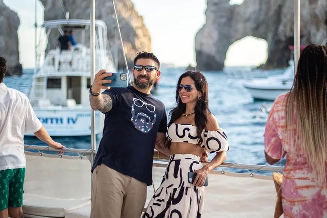 On a d’abord longé Pelican Rock — notre guide Luis a pointé quelques otaries qui se prélassaient, à peine bougeant sauf pour plonger de temps en temps. Ensuite, on est passés devant Lover’s Beach, baignée d’une lumière dorée à cette heure. Tout le monde s’est rassemblé d’un côté pour les photos à l’Arche (le capitaine a même ralenti pour qu’on puisse tous immortaliser le moment — je crois que mes cheveux faisaient leur propre show sur chaque cliché). La musique a commencé à monter en puissance en direction de l’océan Pacifique ; quelqu’un a demandé du reggaeton et soudain, la moitié du bateau dansait ou faisait semblant de connaître les pas.