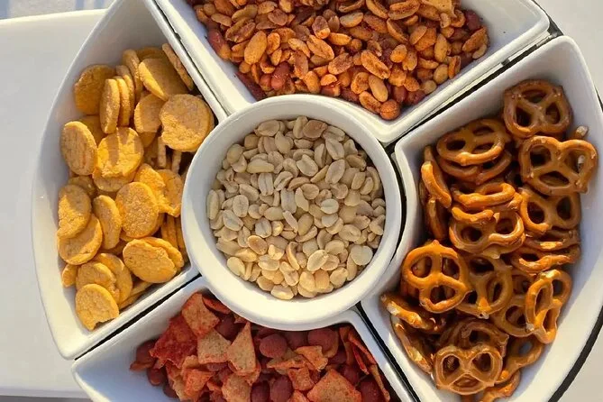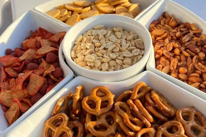Des snacks légers comme des chips sont proposés, accompagnant les boissons de l’open bar.