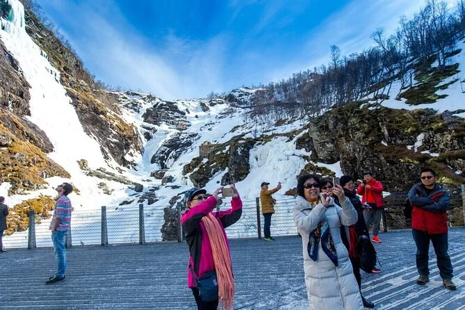 Vous vous arrêterez à la cascade Tvindefossen près de Voss et verrez Kjosfossen depuis le train de Flåm.