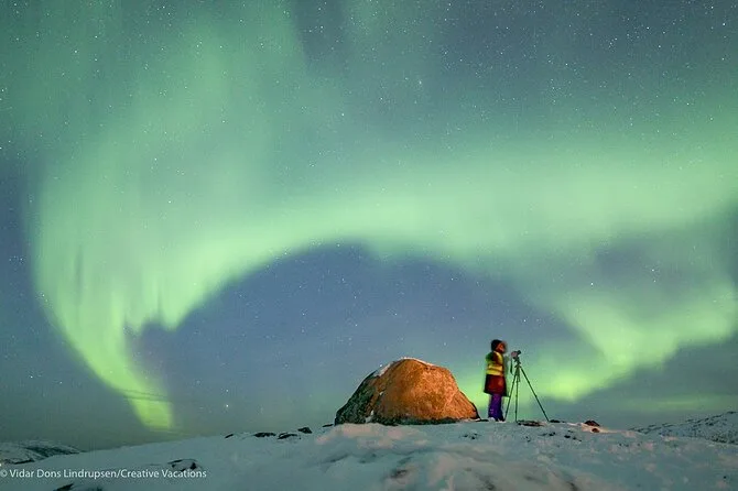 Vous serez bien équipé près de Tromsø pour partir sous un ciel noir avec un photographe-guide local, écouter des légendes norvégiennes en cherchant l’aurore boréale. Soupe chaude au coin du feu, biscuits et café pour réchauffer vos mains, et un coup de main pour vos photos (ou simplement profiter du moment). Plus qu’une chasse aux lumières, c’est un partage de silence et d’histoires sous un ciel en mouvement.
