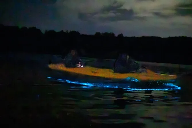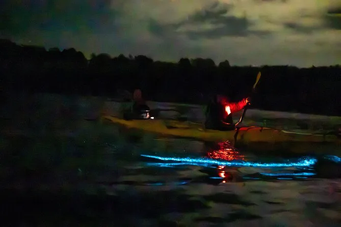 Une fois sur l’eau, tout est devenu calme, à part le bruit des pagaies qui plongent et quelques rires quand quelqu’un zigzaguait un peu trop près. La première fois que ma pagaie a fendu l’eau, elle a laissé une traînée bleutée derrière elle — j’ai cru que mes yeux me jouaient des tours. Puis Jamie nous a encouragés à agiter nos mains dans l’eau et soudain, tout le monde a commencé à le faire, regardant ces petites étincelles s’allumer autour de nos doigts. Ce n’était pas comme des feux d’artifice, plutôt comme des petits secrets qui scintillaient sous la surface. Je n’arrêtais pas de penser à quel point tout semblait étrangement silencieux là-bas.