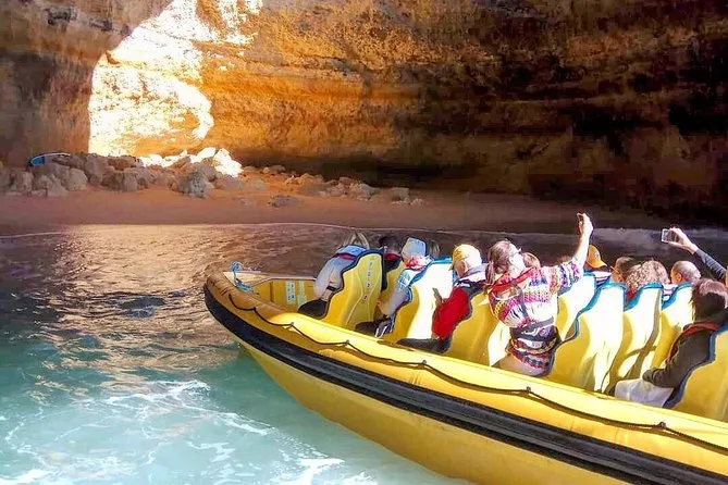 La croisière longe la côte d’Albufeira jusqu’à la plage de Carvoeiro, incluant Benagil ; la durée dépend des conditions maritimes, comptez plusieurs heures au total.
