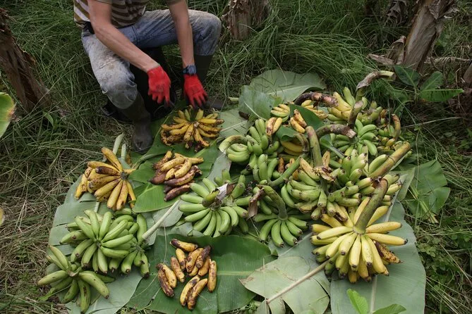 Le dernier arrêt était leur plantation familiale de bananes, cachée derrière quelques murs de pierre. Nous avons vérifié si des régimes étaient mûrs (un était presque prêt). On sentait partout l’odeur de la terre et des feuilles vertes — un contraste total avec l’air salé de la côte plus tôt dans la journée.