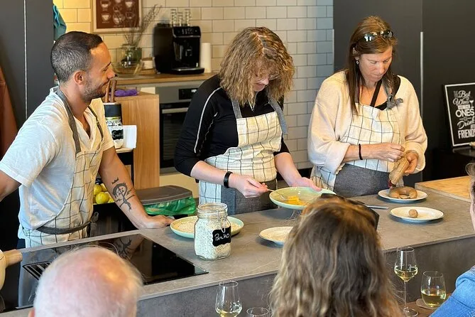 Votre journée comprend une visite guidée du marché Bolhão à Porto, puis un court trajet en métro pour traverser le pont jusqu’à Gaia. Vous participerez ensuite à un cours de cuisine décontracté avec croquettes d’alheira, morue crémeuse, pastel de nata en dessert—le tout accompagné de vin local, café ou thé au déjeuner.