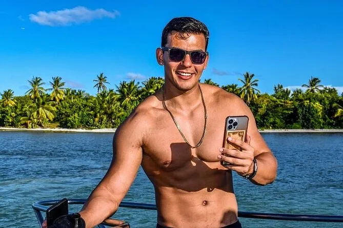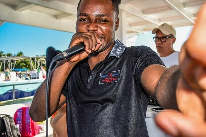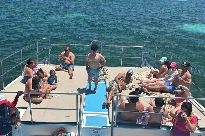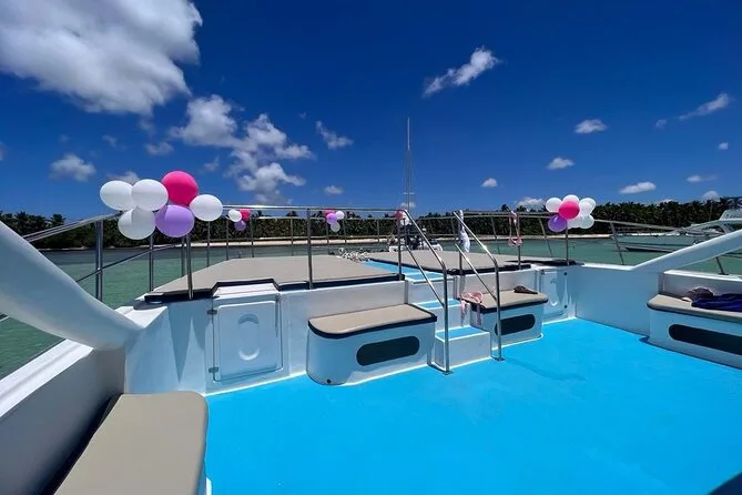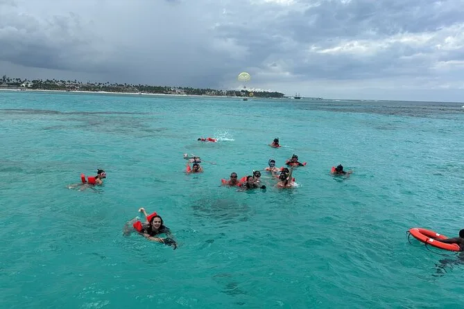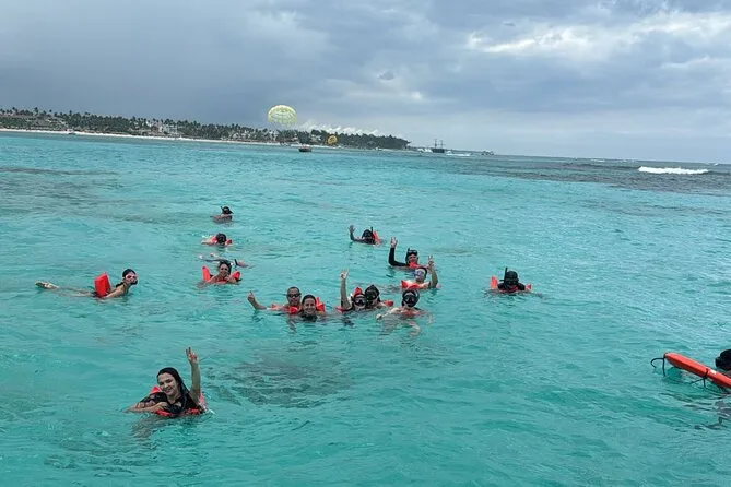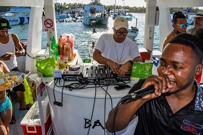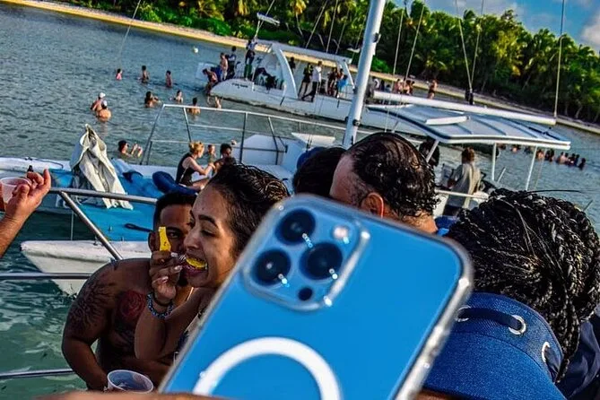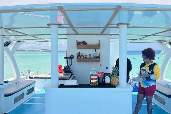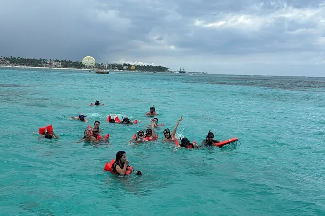 La première chose qui m’a frappé, c’était la brise salée—douce, pas trop forte, juste ce qu’il faut pour décoiffer légèrement en montant à bord du catamaran. Tout de suite, quelqu’un m’a tendu un punch au rhum bien frais (ils ne lésinent pas sur les fruits), et j’entendais déjà le DJ s’installer à l’arrière. Le bateau n’était pas bondé, mais il y avait un joli mélange : des couples, quelques familles, des amis venus fêter un anniversaire. Nous avons quitté la plage de Bavaro en dérivant doucement, regardant le sable s’éloigner tandis que l’eau prenait cette teinte bleue incroyable qu’on ne voit que sur les cartes postales.