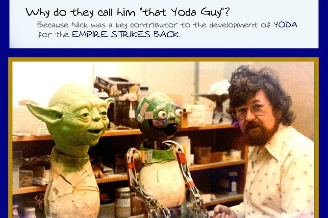J’ai tenté de lire quelques scripts originaux des « Aventures de Luke Starkiller » exposés, mais Nick a commencé à raconter à un enfant comment il fabriquait les Ewoks avec de la mousse et beaucoup d’espoir (ses mots). L’endroit ressemble moins à un musée qu’à un grenier rempli de trésors — sauf que ce grenier appartient à un homme qui a vraiment participé à la création de Yoda. Pas de parcours imposé, vous pouvez revenir sur vos pas ou simplement rester à écouter Nick raconter ses expériences sur Shining ou Men In Black. Il ne cache rien, parle autant des échecs que des réussites.