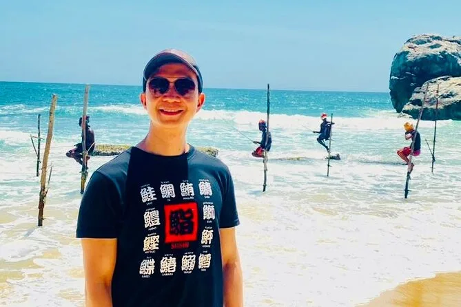Le déjeuner s’est pris sur la plage d’Unawatuna — des chaises en plastique dans le sable, un curry épicé qui m’a fait couler le nez (dans le bon sens), les vagues qui venaient s’écraser à quelques mètres. On a regardé les pêcheurs sur échasses, qui semblaient marcher sur un fil au milieu de l’eau ; Sunil a plaisanté en disant que je tomberais en deux secondes si j’essayais. Peut-être qu’il a raison. Sur le chemin du retour, on s’est arrêtés à la pagode de la paix japonaise — un moment de calme après toute cette couleur et ce bruit — à regarder les nuages du soir glisser sur la ville de Galle. Le trajet du retour m’a paru plus lent, plus doux.