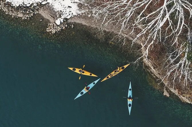 Je ne pensais pas avoir aussi chaud — ces combinaisons font vraiment leur job — mais mes orteils picotaient encore après une heure. On s’est arrêtés au milieu du lac pour des photos (incluses dans la sortie, pas besoin de risquer son téléphone), et j’ai essayé de capturer cette étrange couleur bleu-vert de l’eau avec mes yeux, car les appareils photo ne la rendent jamais bien. Le soleil a percé quelques minutes, illuminant la neige sur nos pagaies. Je repense souvent à cette vue quand le bruit reprend chez moi.