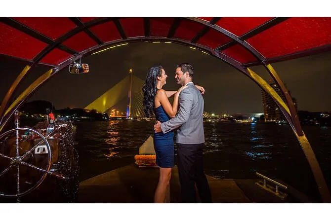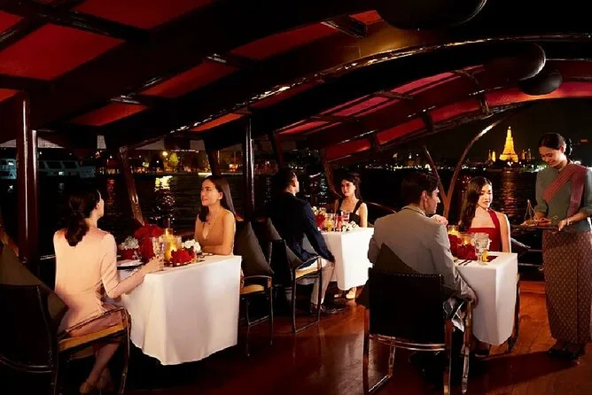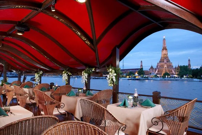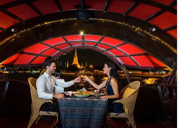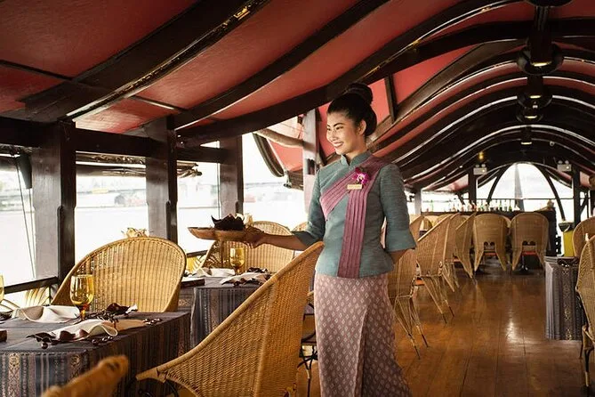 Votre soirée débute avec des canapés servis 30 minutes avant l’embarquement au Manohra Lounge, près du quai. Ensuite, vous profiterez d’un dîner thaï en quatre plats à bord d’une barge à riz restaurée, en glissant sur le Chao Phraya à Bangkok, avec des vues sur Wat Arun et le Grand Palais. Les boissons sans alcool à volonté sont incluses pendant tout le repas ; les boissons alcoolisées sont disponibles à l’achat si vous le souhaitez.