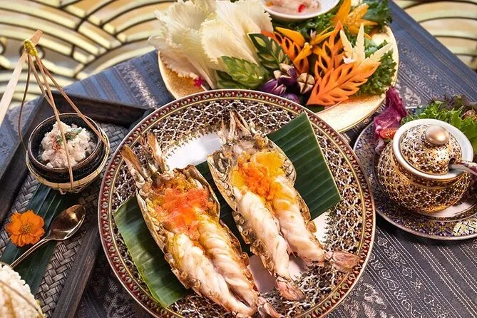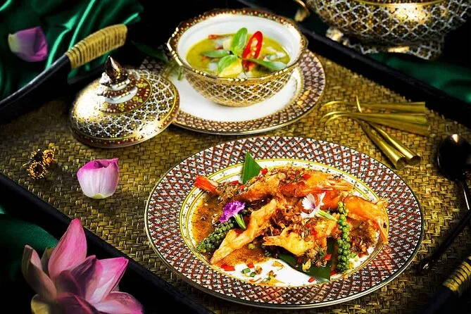 La croisière inclut des canapés avant l’embarquement dans le salon, un dîner thaï en quatre plats à bord du Manohra, boissons sans alcool à volonté et vues sur les principaux monuments.
