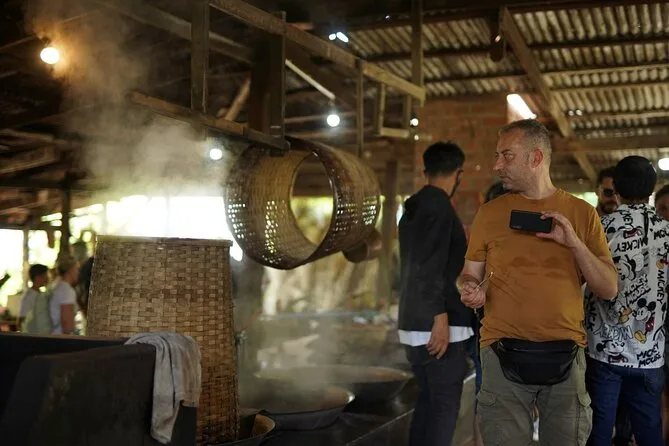 Après avoir serpenté à travers le marché, on s’est arrêtés dans ce que Nok appelle « la maison du sucre brun de coco ». En fait, c’est juste la cuisine d’une famille sur pilotis au-dessus du canal. Ils nous ont montré comment ils font réduire la sève de coco jusqu’à ce qu’elle épaississe et prenne une belle couleur dorée. La vapeur avait un parfum de noisette sucrée qui collait à ma peau sous la chaleur. J’ai essayé de remuer avec leur grande palette en bois — bien plus lourde que ça en a l’air — et tout le monde a rigolé quand j’ai éclaboussé ma chemise (ça partait… à peu près). Ils nous ont laissé goûter leur sucre encore tiède ; honnêtement, c’était un goût inédit pour moi.