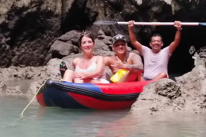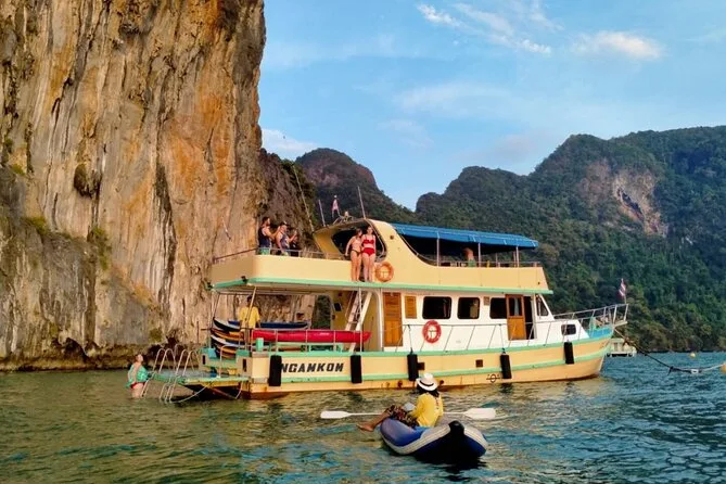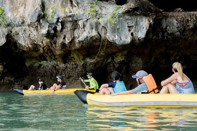 Votre journée comprend la prise en charge à votre hôtel à Phuket, tous les frais d’entrée et taxes, des canoës sécurisés avec des rameurs locaux pour vous guider dans les grottes et lagunes, des boissons non alcoolisées, des fruits et snacks pour le déjeuner, puis un dîner thaï complet servi à bord au coucher du soleil dans la baie de Phang Nga, avant de rentrer de nuit après avoir vu le plancton bioluminescent illuminer l’eau sous vos mains.