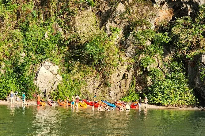 Le déjeuner a commencé juste au moment où les falaises calcaires défilaient devant la fenêtre. Je ne pouvais pas m’empêcher de fixer ces formes rocheuses étranges — Minh m’a montré une qui ressemblait à un poulet, mais honnêtement, je ne voyais pas. Après avoir jeté l’ancre, le kayak autour de Cap La était plus calme que prévu. On entendait son propre coup de pagaie résonner contre la pierre. Mes bras me faisaient mal au bout de vingt minutes, mais ça m’était égal. De retour sur le bateau, on a fait un cours de cuisine (j’ai raté mes rouleaux de printemps, Minh a rigolé et a essayé de réparer ça) puis, le soir, pêche au calamar sous les lumières jaunes du pont. Pas une prise, sauf peut-être une bière fraîche.