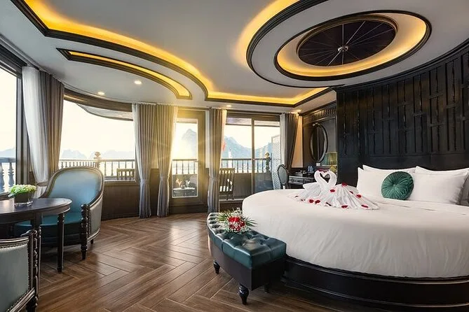 Votre journée comprend le transfert aller-retour Hanoi - baie d’Halong en navette express, les entrées pour tous les sites dont l’île Ti Top et la grotte Sung Sot, le matériel de kayak et les balades en bateau de bambou dans les grottes de Lan Ha, du temps libre pour nager ou bronzer, des ateliers cuisine animés par des chefs locaux (avec rouleaux de printemps !), des repas complets avec fruits de mer ou options végétariennes, une happy hour avec jus ou vin au coucher du soleil, des animations en soirée comme la pêche au calmar ou des jeux de cartes à bord — et votre cabine privée climatisée pour une nuit paisible sur la baie.