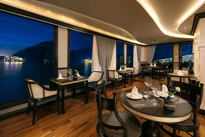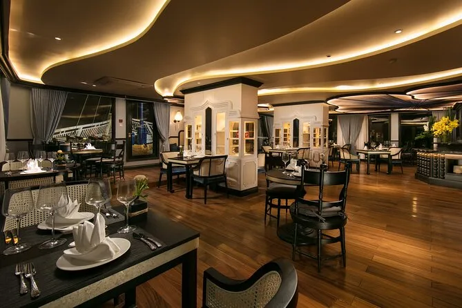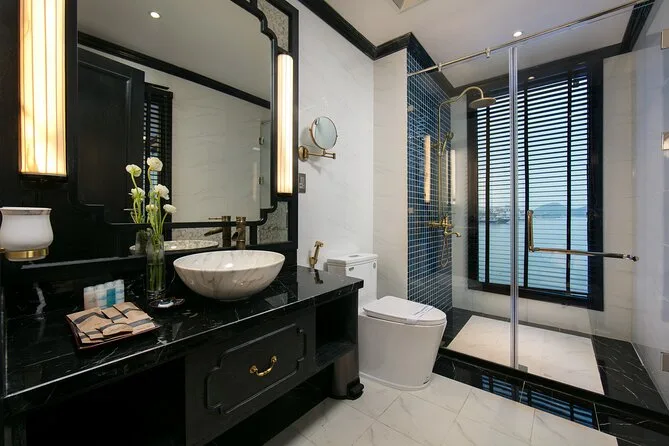 Votre voyage comprend le transfert aller-retour entre Hanoi et Halong en bus ou limousine (environ trois heures par trajet), de l’eau en bouteille pendant le trajet, les entrées pour des sites comme la grotte Dark n Bright et le village flottant de Tra Bau, des balades en kayak ou en bateau de bambou selon votre choix, des pauses baignade à l’île des Trois Pêches ou d’autres endroits selon la météo, ainsi que tous les repas — déjeuners et dîners servis à bord avec des saveurs locales. Votre cabine deluxe est équipée d’une salle de bain privée (avec baignoire si vous êtes en suite), le WiFi gratuit est disponible dans les espaces communs pour jeter un œil à vos messages. Une séance de cuisine a lieu au coucher du soleil avant le dîner — bref, tout est prévu avant le retour à Hanoi le lendemain.