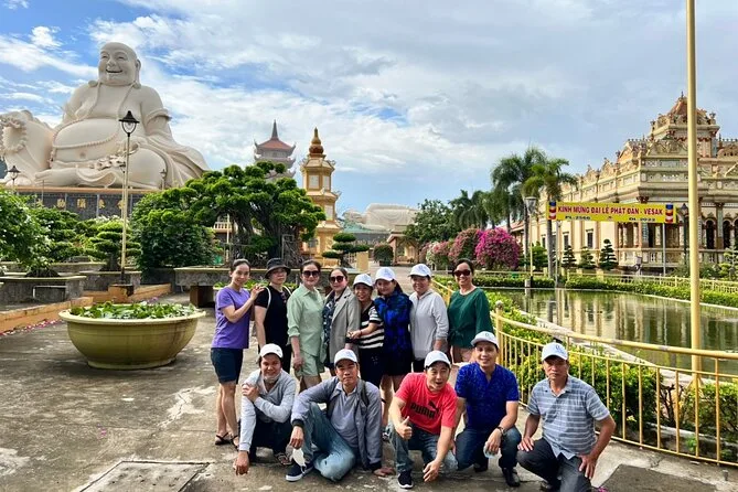 L’air était chargé d’une brume matinale alors que nous attendions devant notre hôtel dans le District 1. Notre guide — chaleureux et décontracté — nous a salués par notre prénom et distribué des bouteilles d’eau fraîche avant de monter dans le van. Le trajet jusqu’à My Tho était d’abord silencieux, juste le bourdonnement du trafic et le chant lointain d’un coq derrière une boutique. Une fois arrivés à la pagode Vinh Trang, j’ai senti l’encens flotter dans les jardins, tandis que des moines en robes safran s’occupaient des bassins de lotus. La pagode elle-même est un mélange fou de couleurs et de sculptures — des dragons vietnamiens s’enroulant autour de portails à la chinoise, des petits détails partout où le regard se pose.