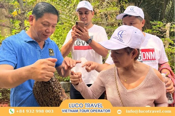 Nous avons embarqué sur un bateau en bois à Ben Tre, où les cocotiers bordent les rives si densément qu’on peine à voir au-delà. Notre guide nous a montré des maisons flottantes et des enfants saluant depuis leurs minuscules pirogues. Dans un atelier familial de bonbons à la noix de coco, j’ai essayé d’étirer du sucre chaud sur des plateaux collants (plus difficile qu’il n’y paraît) pendant que le chien du propriétaire faisait la sieste à nos pieds. La ferme aux abeilles dégageait une odeur douce — presque trop sucrée — et nous avons goûté le miel directement dans les rayons. Le déjeuner au Viet Nhat Eco-Resort était décontracté ; des hamacs balançaient entre les arbres fruitiers, certains essayaient le vélo sur des sentiers étroits tandis que d’autres se prélassaient avec de l’eau de coco fraîche.