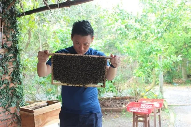 Le déjeuner a suivi dans un restaurant au bord de la rivière, caché derrière des palmiers — une brise venant de l’eau rendait l’atmosphère plus fraîche que prévu. Le menu proposait des spécialités du Mékong (le poisson oreille d’éléphant frit vaut vraiment le détour). Après le repas, Minh nous a guidés le long de sentiers paisibles du village avant de reprendre la route vers Saigon, alors que les nuages de pluie de l’après-midi commençaient à arriver.