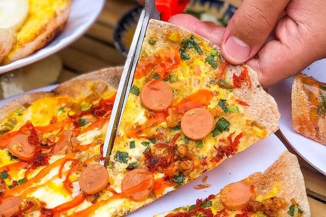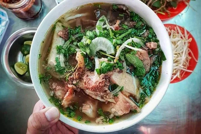 Vous dégusterez du riz gluant à la banane grillée (Chuoi Nep Nuong), des nouilles Bun Bo Hue, du Bo La Lot (bœuf en feuille de bétel), des crêpes Banh Xeo, du porc barbecue vietnamien, des Banh Mi, la pizza vietnamienne, du jus de canne ou de la bière, et la soupe sucrée traditionnelle (chè).
