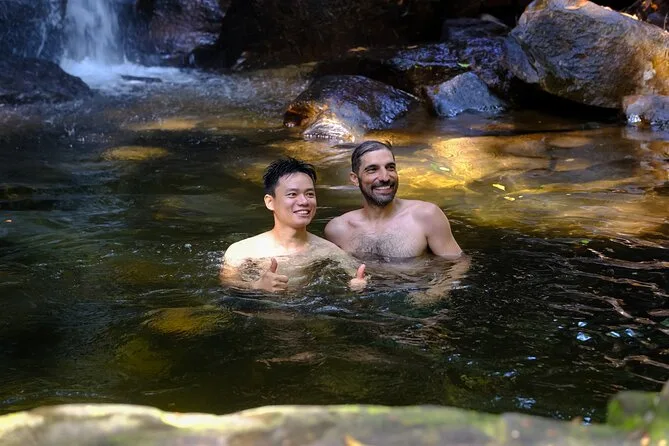 Je ne pensais pas autant aimer la source Suoi Tranh. L’eau est froide au début, ça coupe le souffle, puis c’est parfait une fois habitué. Certains sont partis explorer la grotte à côté — moi, je me suis juste assis sur un rocher, à écouter : l’eau qui coule sur les pierres, des rires au loin d’un autre groupe. Après s’être séchés au soleil (j’ai failli m’endormir), on a terminé dans un petit resto local pour déguster des Banh Xeo. Ils arrivent tout chauds, croustillants, garnis de crevettes et d’herbes — franchement, les tremper dans la sauce nuoc mam, c’est un souvenir qui me reste en tête.