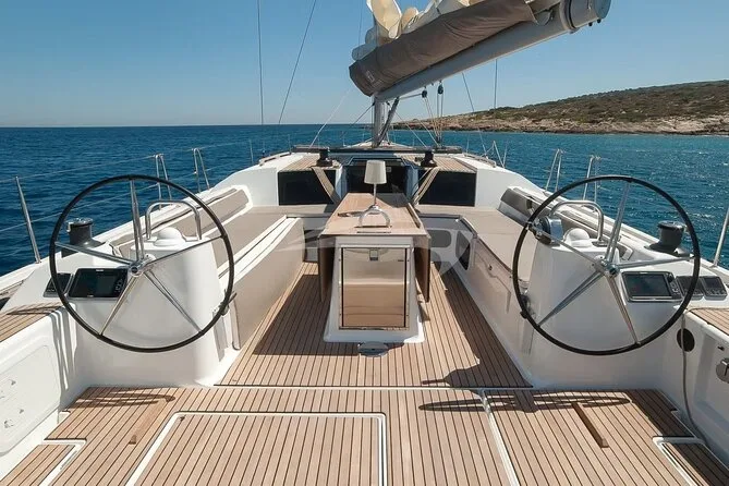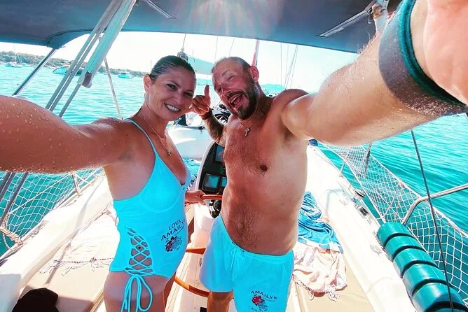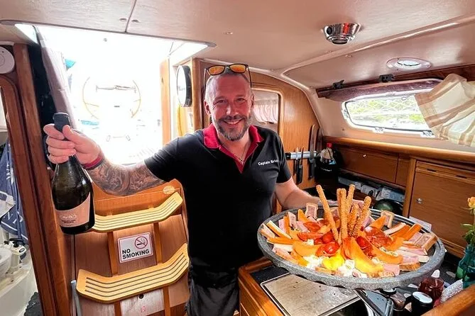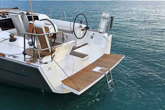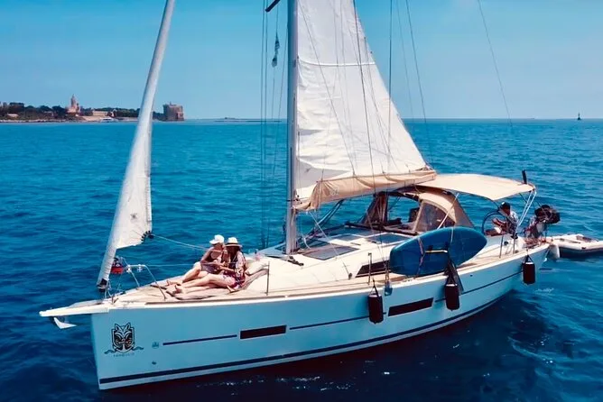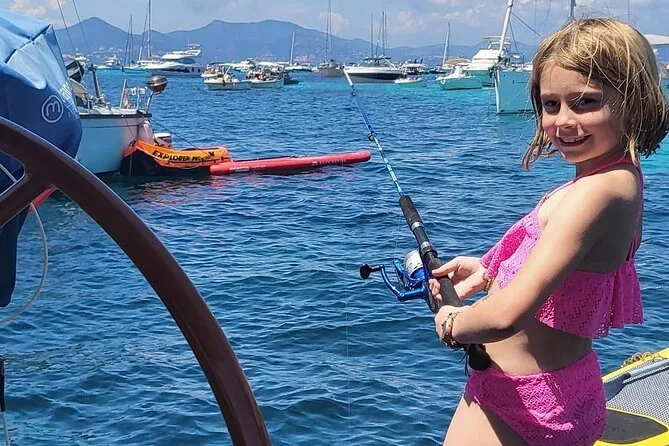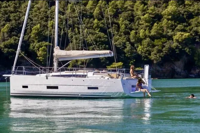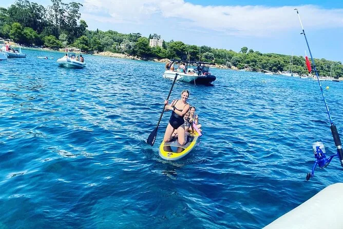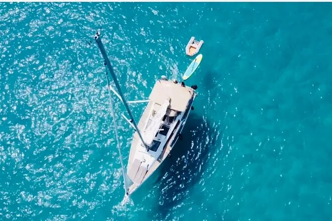 Your day includes exclusive use of a 12-metre Dufour 382 sailboat with professional captain guiding you from Cannes to Lérins Islands and secret coves; all equipment for paddleboarding, snorkeling (including GoPro camera), seabob underwater scooter use; appetizers, snacks and delivery of one wood-fired pizza onboard; music throughout; fishing rods available; soft drinks provided so you can focus on relaxing at sea before returning to port together.