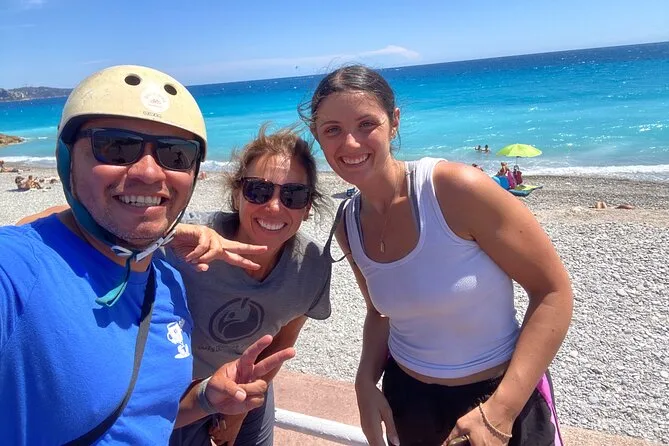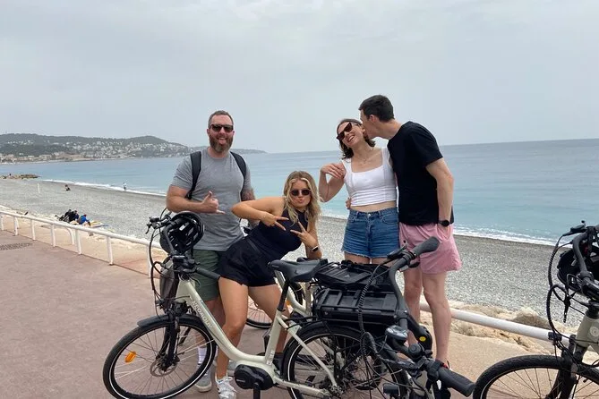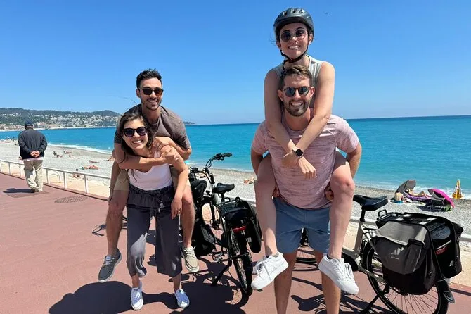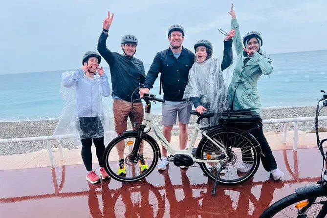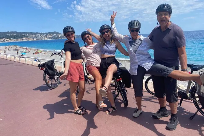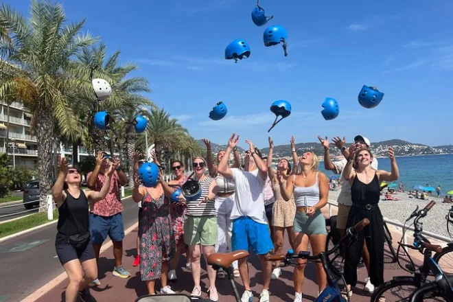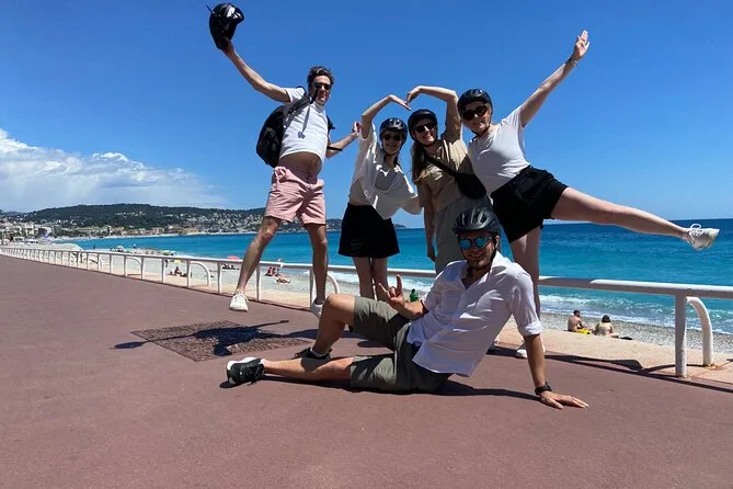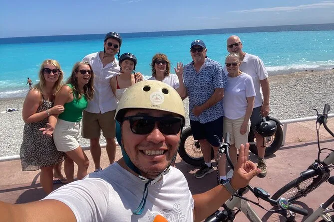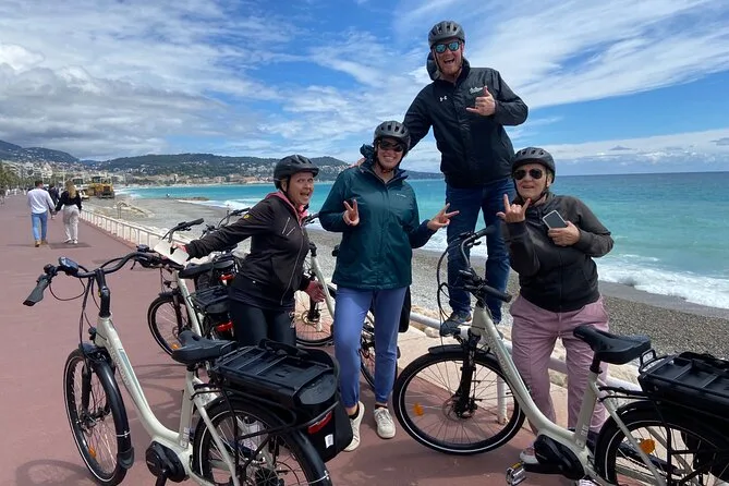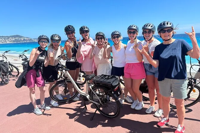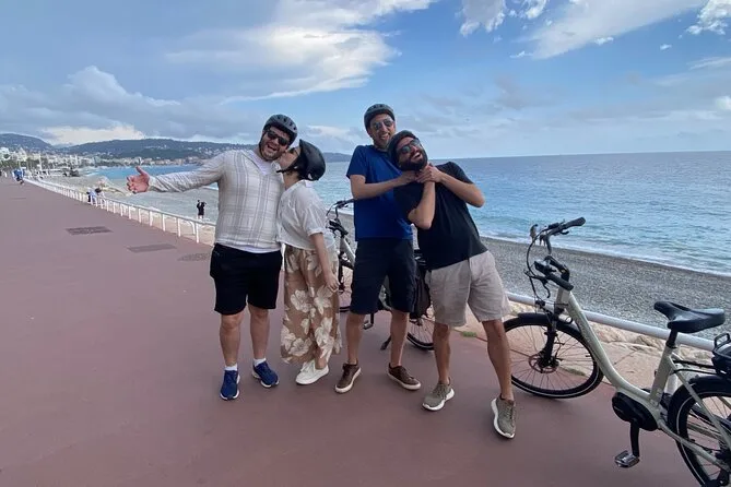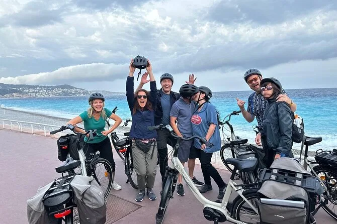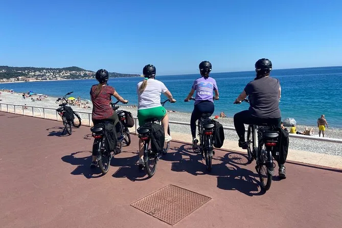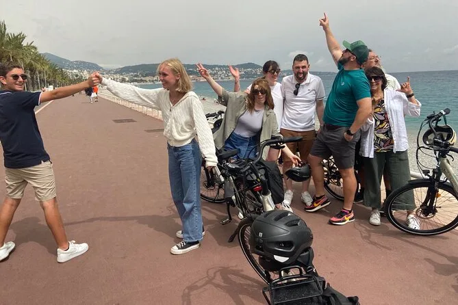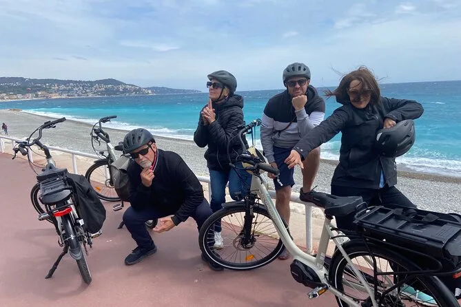 The tour starts near Promenade des Anglais in Nice and includes several hours of cycling with stops at a family-run vineyard for tasting and a picnic before returning.