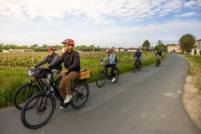 Your day includes pickup by minivan from central Bordeaux, use of electric bikes and safety gear after a short briefing with your guide, two winery visits with at least six tastings of mostly red wines, a homemade picnic lunch served among the vines (with cheese, charcuterie or vegetarian options depending on season), an hour-long guided stroll through medieval Saint Emilion village, plus extra nibbles and one last glass before heading back in comfort to Bordeaux.