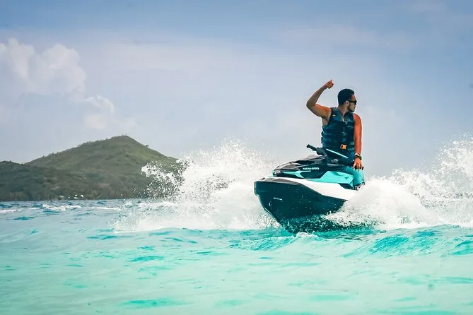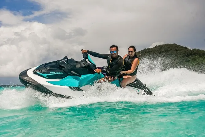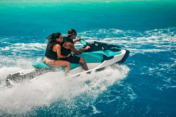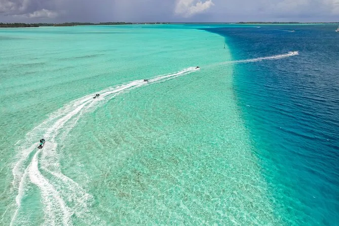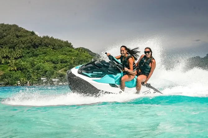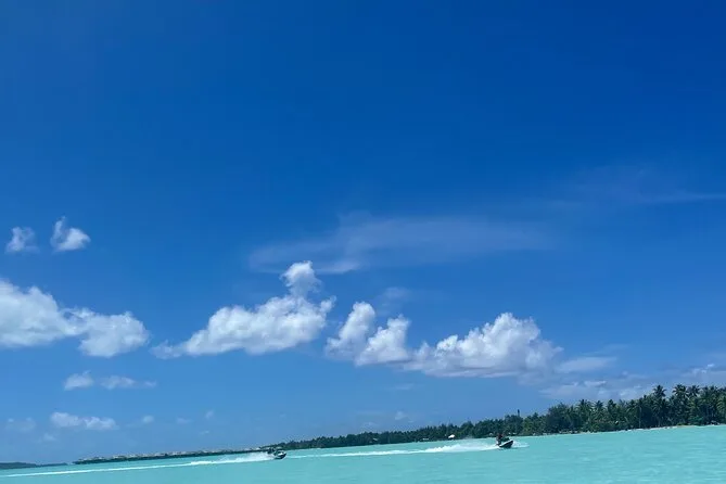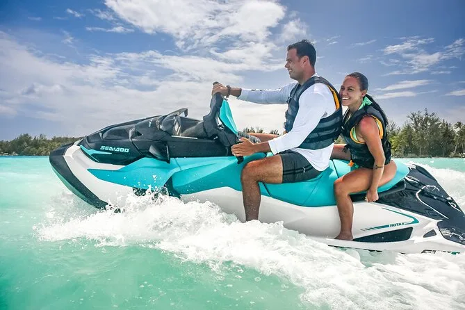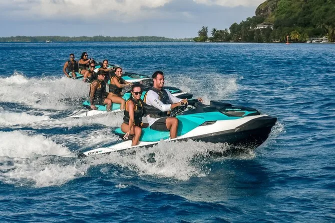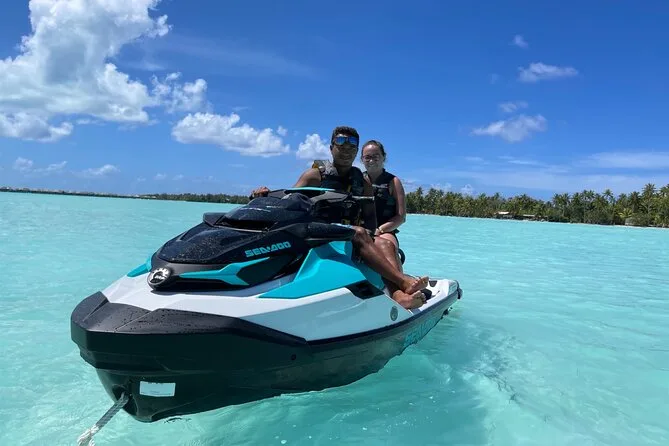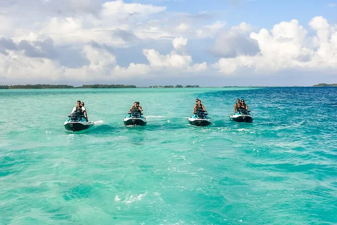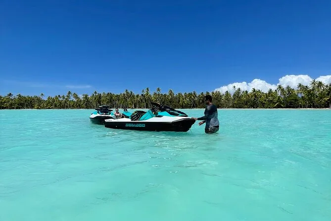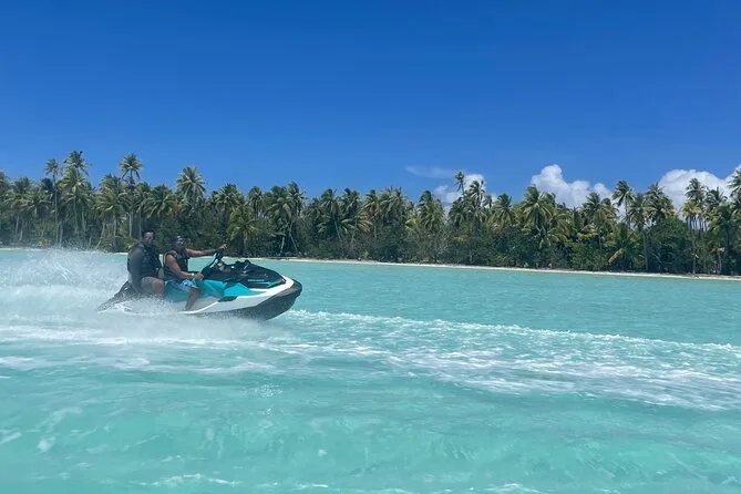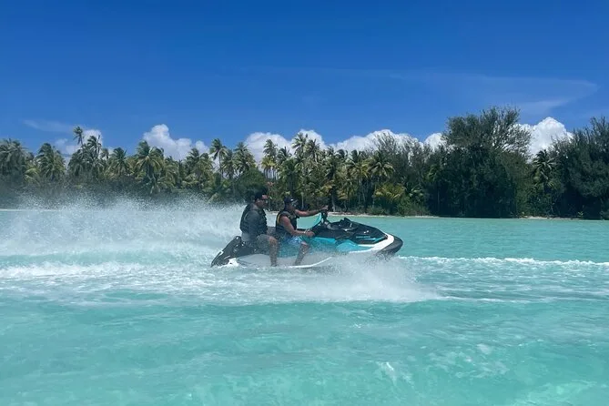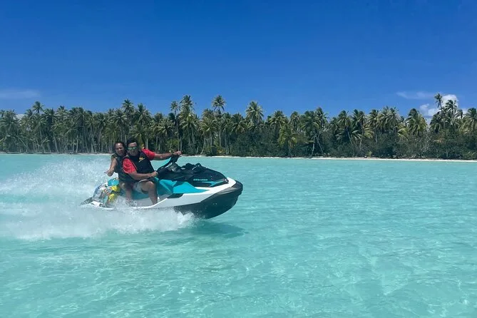 Your day includes private transportation to and from your hotel or meeting point, use of jet skis with safety vests and sun cream supplied by your guide, plus a stop on a motu where you’ll taste fresh exotic fruits like mango and pineapple alongside cool local juices or bottled water before heading back across the lagoon.