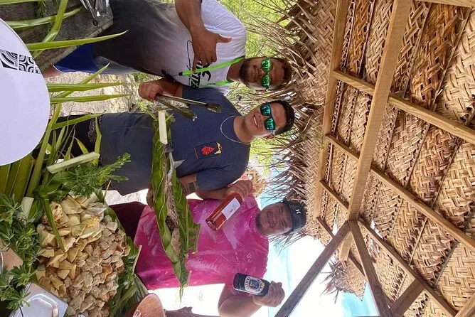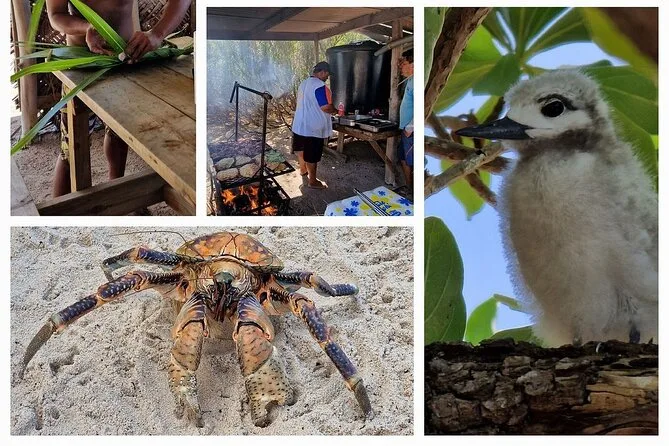 Your day includes dock pickup at 8:30 am (with flexible timing for cruise passengers), a guided boat ride to Rangiroa’s private Blue Lagoon island, snorkeling among sharks, dolphin watching, bird spotting walks, a hands-on braiding workshop, plus a local lunch featuring coconut crab and Rangiroa wine before heading back in the afternoon.