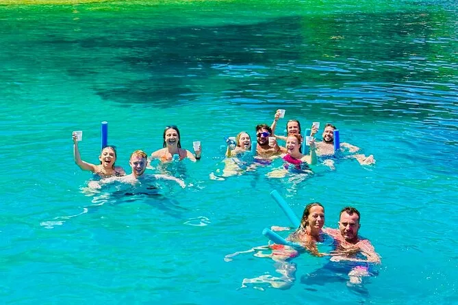 The full-day cruise lasts approximately 8 hours including all swimming stops and lunch.