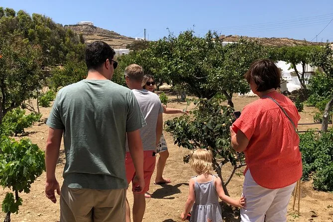 Your day includes guided walks through olive groves and vineyards near Agios Ioannis Beach, all entry fees and taxes covered up front, tastings of local Mykonian wines (or orange juice for kids), plus generous plates of regional appetizers served in a traditional tavern before you head back out into the island air.