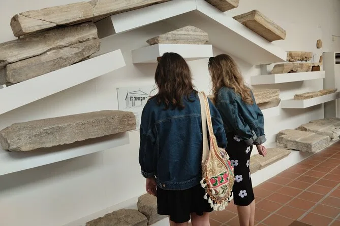 Someone hands me a tiny paper cup of souma before I’ve even finished stepping off the bus in Chalki — our guide just grins and says “for courage.” The morning started with that slow uphill walk to Demeter’s Temple, sunlight already sharp on the old stones. There was this faint smell of wild thyme everywhere, and I kept lagging behind because I couldn’t stop looking at the patterns in the marble. The museum is small but feels oddly personal, like someone’s attic full of stories. We had to pay our own entrance, which surprised me a little, but it meant you could wander as long or as little as you wanted.