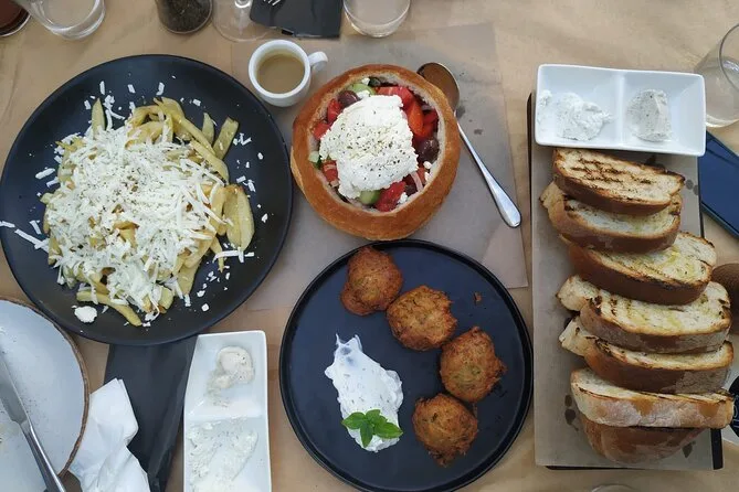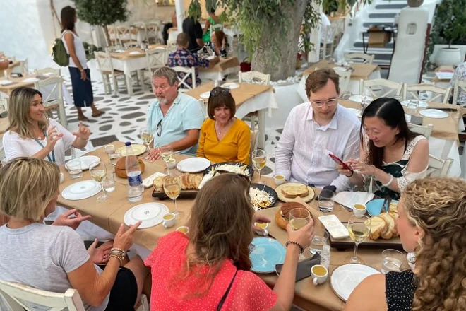 You’ll try several Naxian cheeses, Greek superfood snacks, local specialties like potatoes and sweets, plus family-style mezedes with wine.