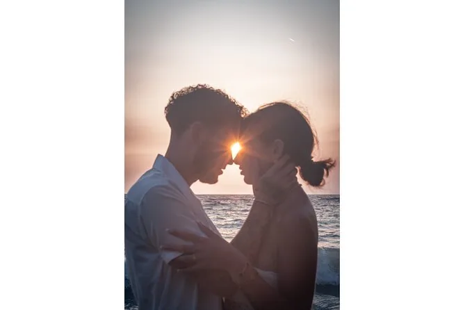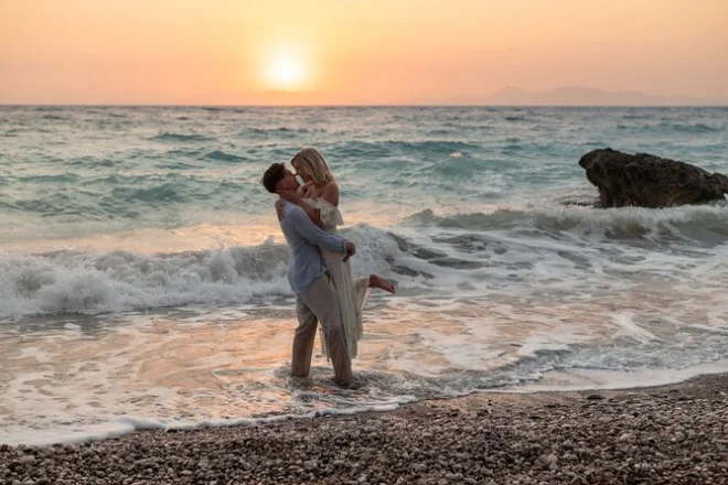 You can pick between that sunset shoot by the sea or wandering through Rhodes Old Town—both are pretty cinematic in their own way. We saw another couple doing their session near those medieval arches; they looked like something out of a movie, honestly. Masha knew all these little corners where the light hit just right or where bougainvillea spilled over a stone wall. At one point she tried to teach me how to say “thank you” in Greek—I absolutely butchered it and she just laughed. It’s funny how quickly you forget there’s even a camera after a while.