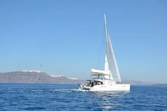 Your day includes complimentary hotel pickup and drop-off in Santorini, use of snorkeling equipment plus towels and swimming aids if you need them. There’s a freshly prepared lunch onboard—grilled seafood or chicken fillet with salads and fruit—and an open bar serving white wine, beer or soft drinks throughout your caldera cruise before arriving under Oia’s cliffs.